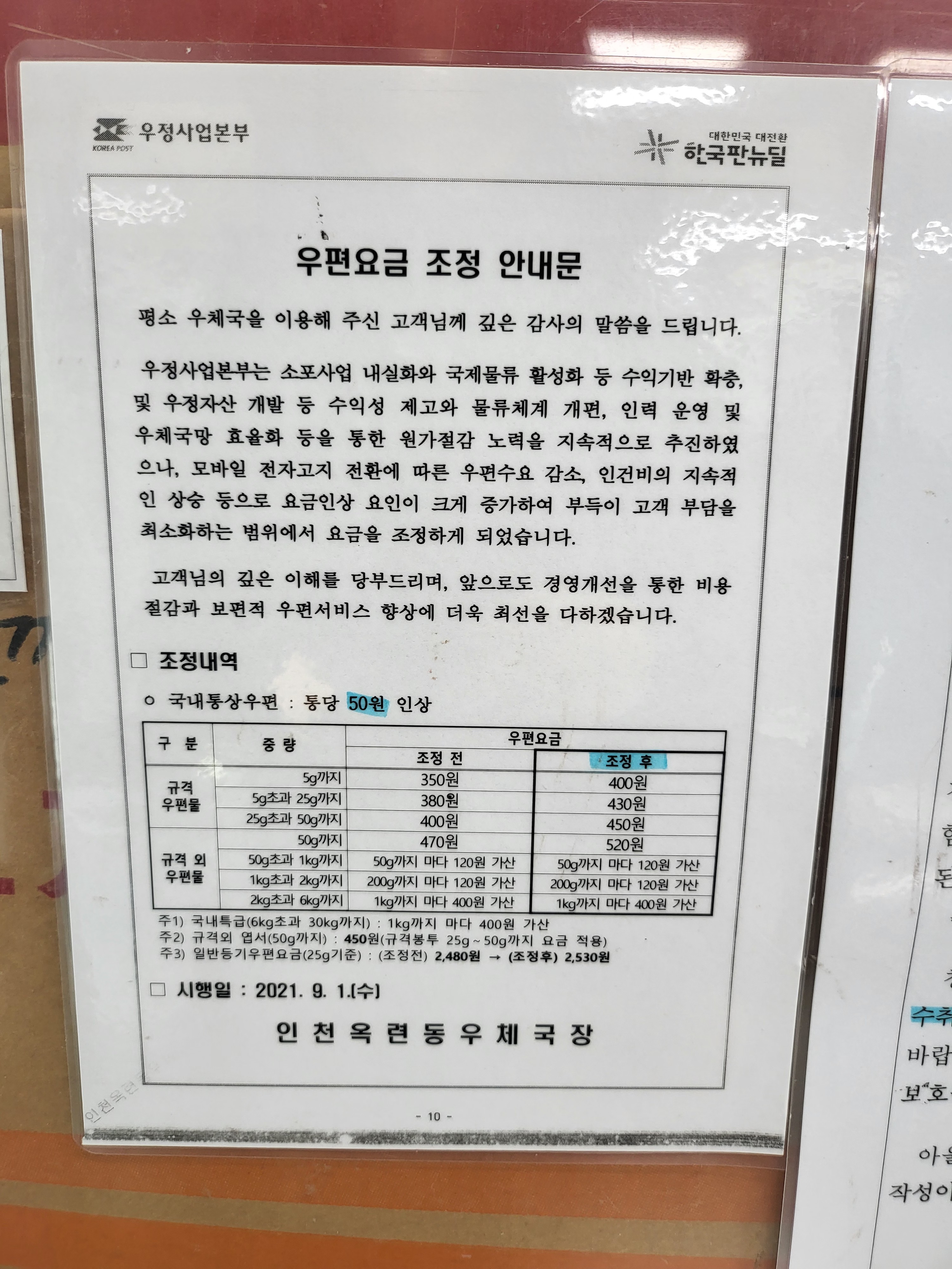 우편요금 조정안내문(2021. 9. 11)