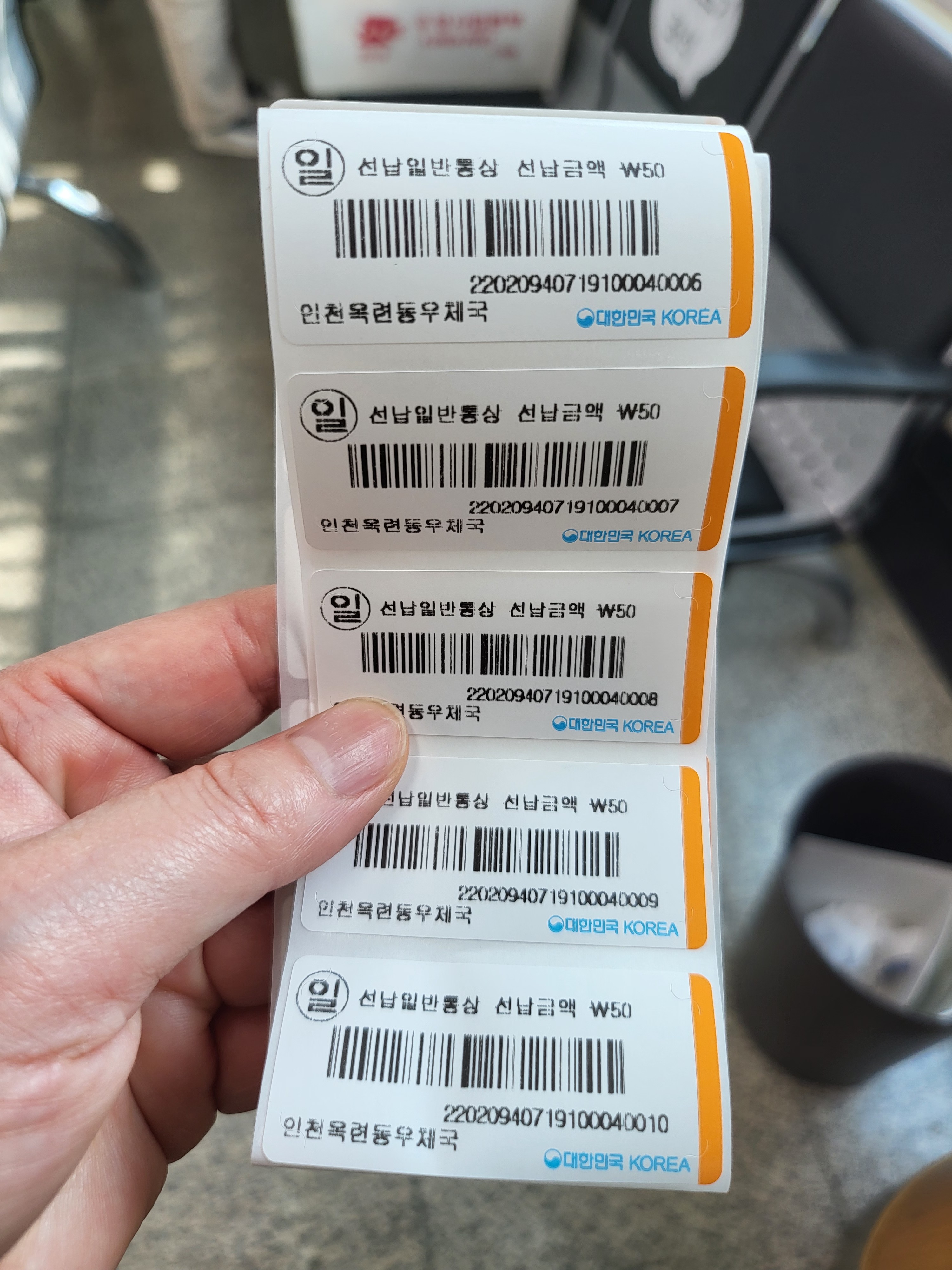50원 인상된 금액만큼 우표를 구매했습니다 그런데 예전처럼 이쁜 우표가 아닌 라벨지로 출력한 우표인지라 이쁨은 없구요. 다행스럽게도 이렇게 구매해 인상분만큼 붙여서 보낼 수 있음에 감사하답니다. 안 그러면 기존에 구매해 놓은 380원짜리 우표는 해결책이 없으니 이 어찌 다행이 아닐 수 있겠어요.